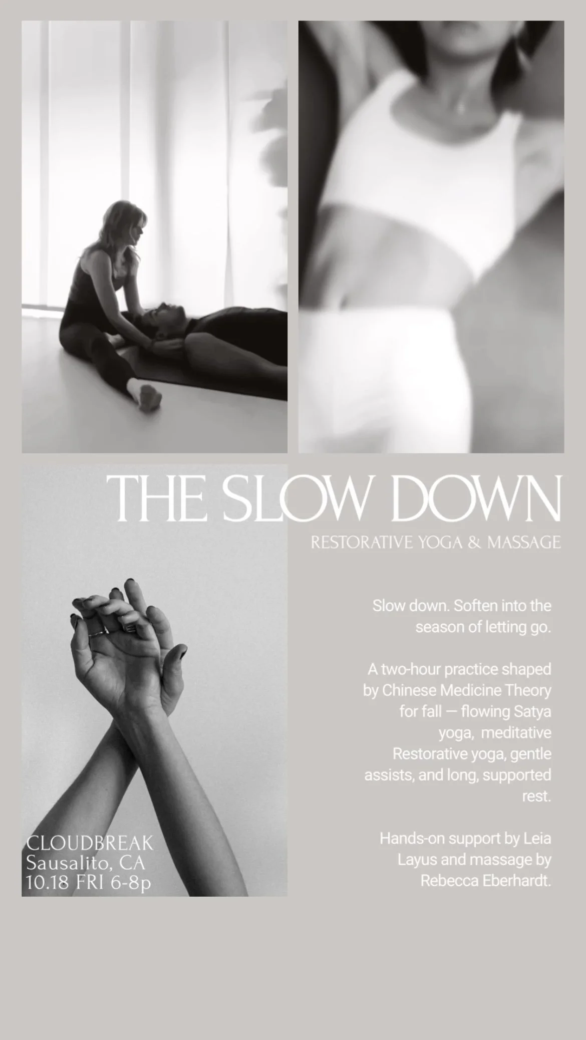 Join Leia Layus and Rebecca Eberhardt for “The Slow Down” to ease your body, quiet your mind, and replenish your spirit. In this special 2 hour class, Leia will open with Dharma and Satya Yoga, a flowing yin style practice with assists and adjustments.